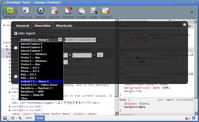 4.overrideタブをクリックすると、以下の画面が表示される。「User Agent」にチェックを入れ、あとは好きなスマホのOSを選択。