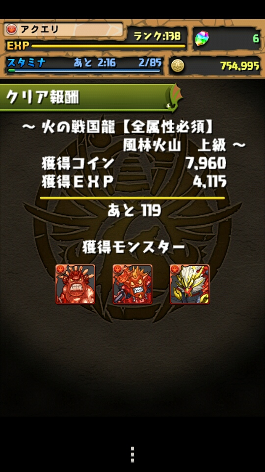 スタミナ調整しつつ、火の戦国龍 上級でぬるくやってたら、ランク上がらないわ、シンゲン落ちるわ…って、おい!w