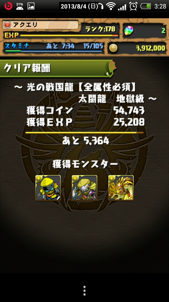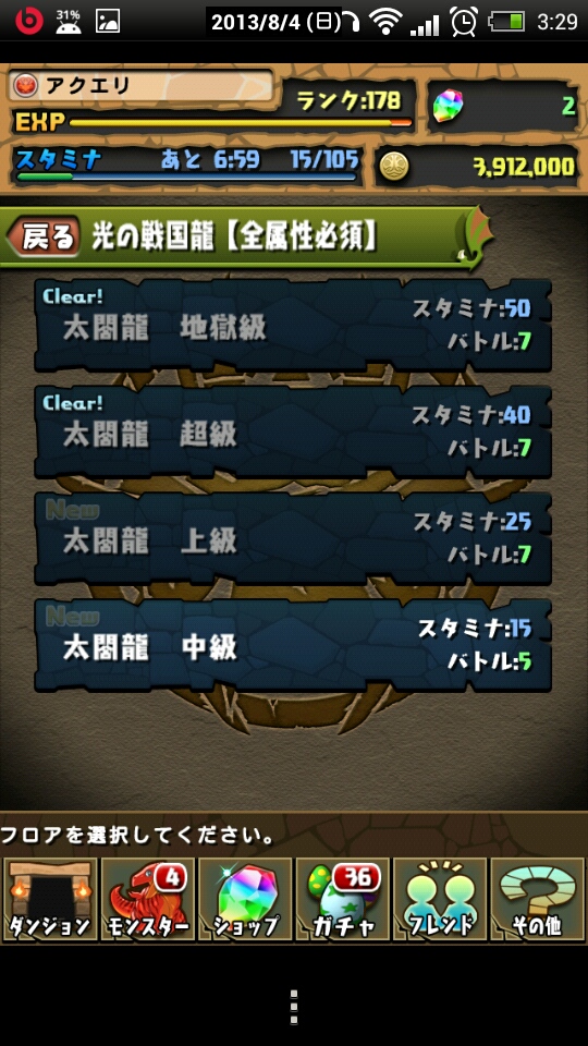 スタミナがもったいないのでと、別のダンジョンに突入して寝ようとしたら、間違えて「光の戦国龍 地獄級」に突入してしまった。