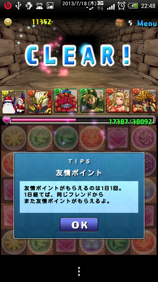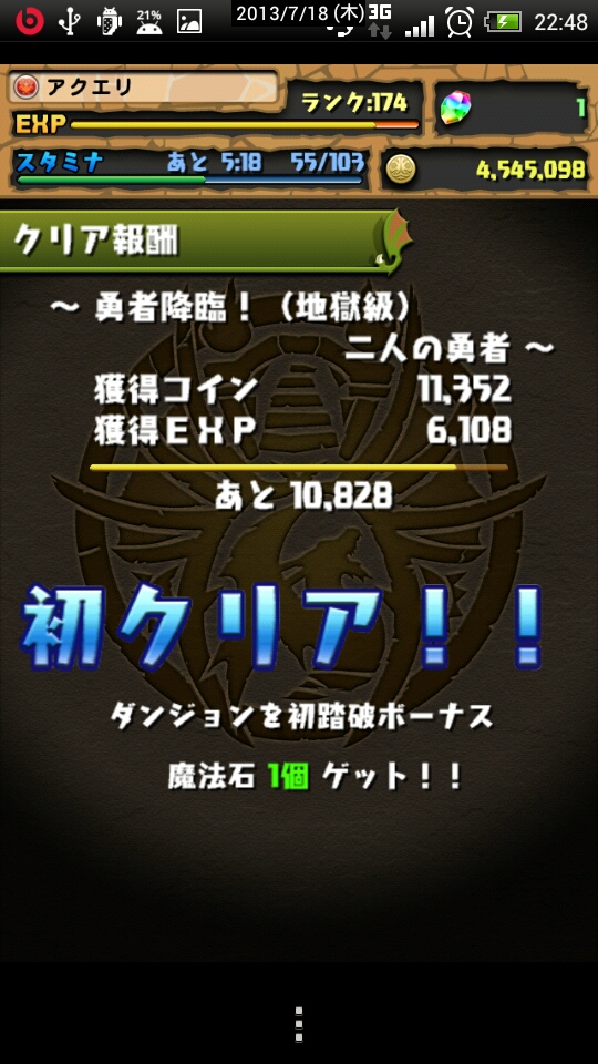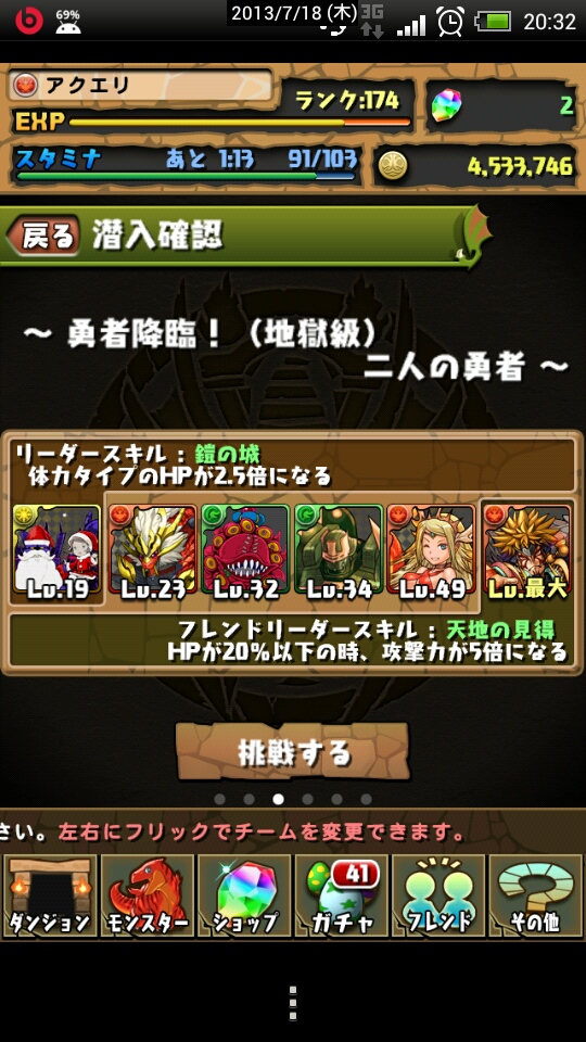 帰宅中にみったんからのメールに気づき、勇者降臨!を1コンでクリアしたとの連絡が。おっしゃ、そしたらやったろやないか!wめちゃめちゃHPあったら勝てるだろwと甘い考えの中突入!