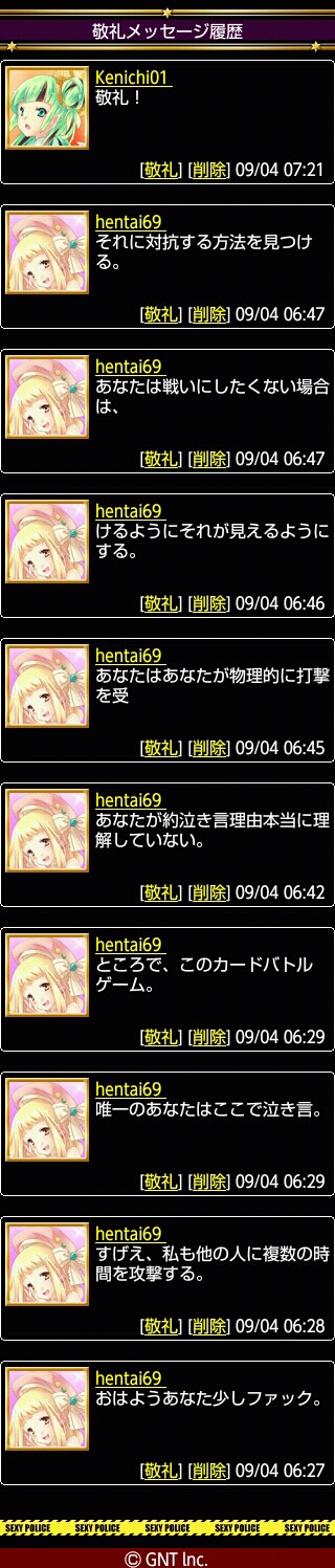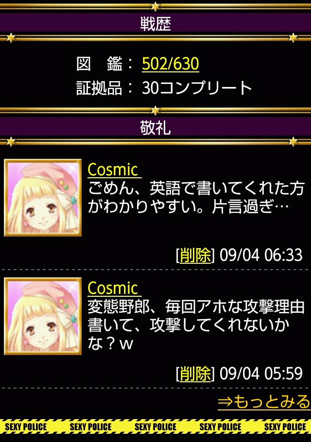 「自分(変態)は他の人も複数回攻撃してる。これはカードバトル。あなた(Cosmic)が泣き言を言っている意味がわからない。そして攻撃した結果をブログに載せて他の人からも閲覧できるようにしている。攻撃されたくなかったら、攻撃されない方法を考えてみろ。」