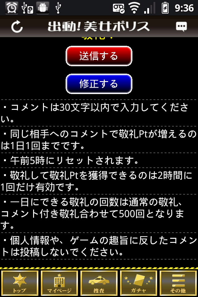 「1日にできる敬礼の回数は通常の敬礼、コメント付き敬礼合わせて500回となります。」